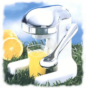 OJ Home JuicerThere's just no substitute for a properly squeezed orange in the morning. So delicate and refreshing. The finest hotels use mechanical juicers of this type for their most discriminating guests. This is the largest selling juicer of its kind. It's a beautiful little all-metal piece in baked enamel and polished chrome; it even won the Frankfurt Fair Award for its design. Uses no electricity and produces no non-recyclable waste as do frozen juices.